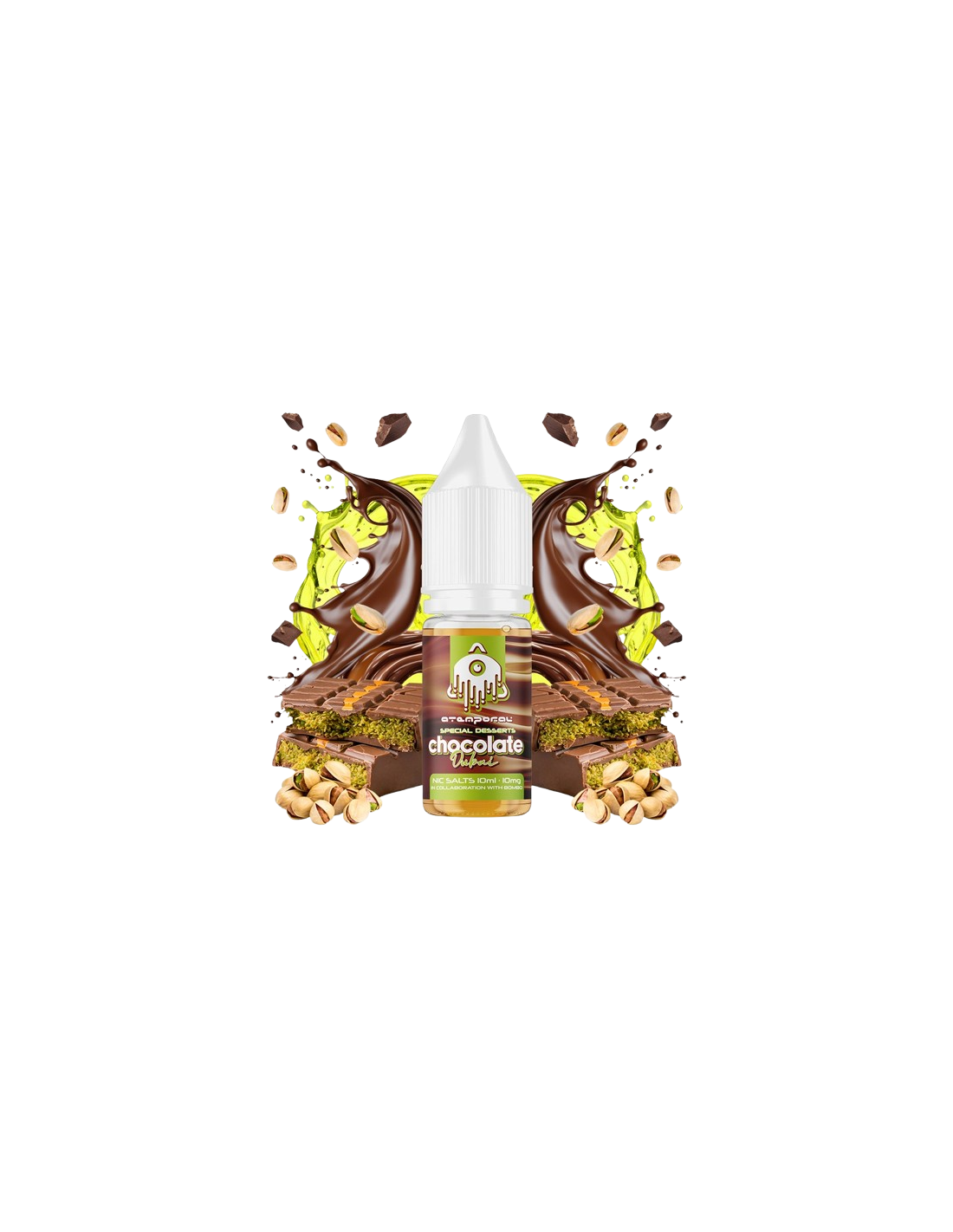 El Chocolate Dubai de Atemporal Nic Salts es un homenaje al lujo y el sabor de Oriente Medio. Inspirado en el postre homónimo, combina lo mejor del chocolate con leche, el toque exótico de la crema de pistacho y la textura crujiente y dulce de la pasta kataifi, ofreciendo una experiencia de vapeo digna de los paladares más exigentes.